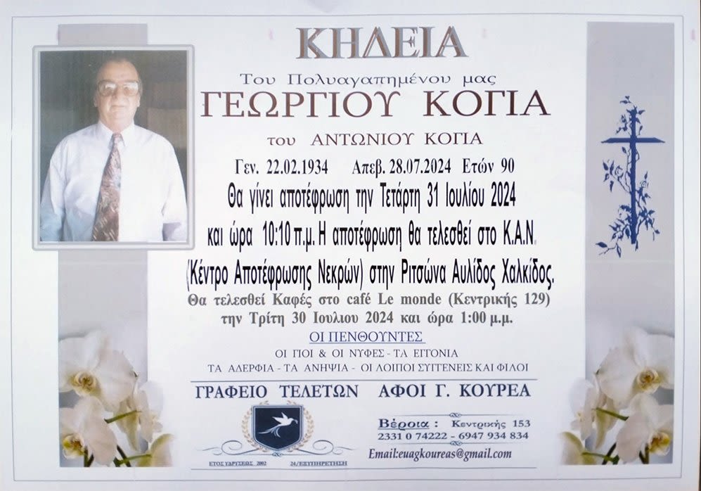 Έφυγε από τη ζωή ο Γεώργιος Αντ. Κόγιας σε ηλικία 90 ετών. Θα γίνει αποτέφρωση την Τετάρτη 31 Ιουλίου 2024 στις 10.10 π.μ. στο Κέντρο Αποτέφρωσης Νεκρών στην Ριτσώνα Αυλίδος Χαλκίδος. Θα τελεσθεί καφές στο cafe Le monde (Κεντρικής 129) την Τρίτη 30 Ιουλίου 2024 στις 1.00 μ.μ.