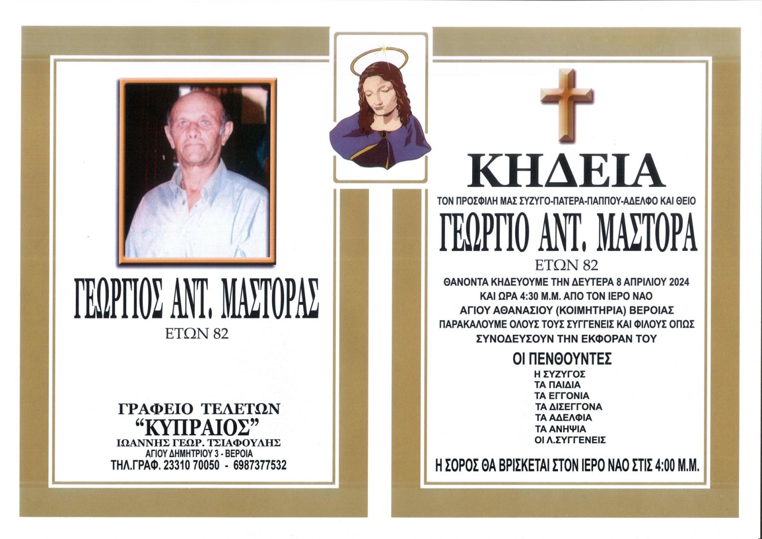 Έφυγε από τη ζωή και κηδεύεται την Δευτέρα 8 Απριλίου 2024 στις 4.30 μ.μ. από τον Ιερό Ναό Αγίου Αθανασίου (Κοιμητήρια) Βέροιας ο Γεώργιος Αντ. Μάστορας σε ηλικία 82 ετών.