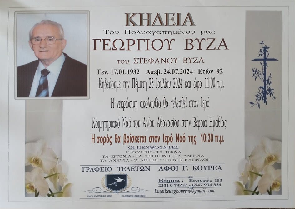 Έφυγε από τη ζωή και κηδεύεται την Πέμπτη 25 Ιουλίου 2024 στις 11.00 π.μ. από τον Ιερό Ναό Αγίου Αθανασίου (Κοιμητήρια) Βέροιας ο Γεώργιος Στεφ. Βύζας σε ηλικία 92 ετών.