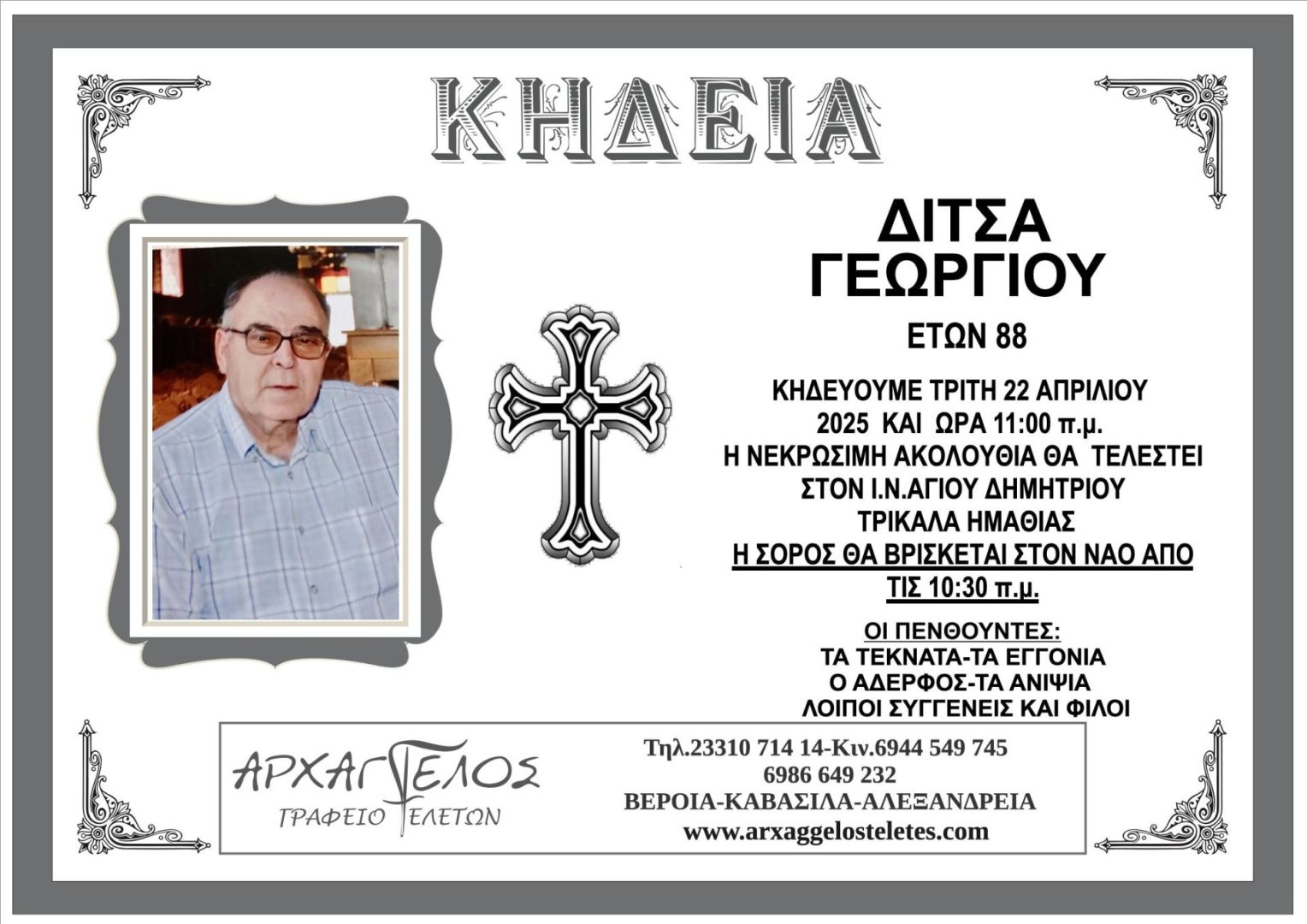 Έφυγε από τη ζωή και κηδεύτηκε σήμερα Τρίτη 22 Απριλίου 2025 στις 11.00 π.μ. από τον Ιερό Ναό Αγίου Δημητρίου στα Τρίκαλα Ημαθίας ο Γεώργιος Δίτσας σε ηλικία 88 ετών.