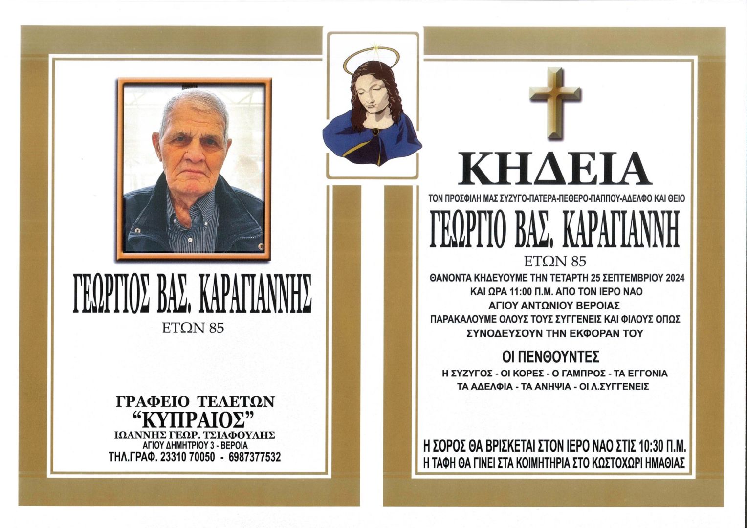 Έφυγε από τη ζωή και κηδεύεται την Τετάρτη 25 Σεπτεμβρίου 2024 στις 11.00 π.μ. από τον Ιερό Ναό Αγίου Αντωνίου Βέροιας ο Γεώργιος Βασ. Καραγιάννης σε ηλικία 85 ετών.