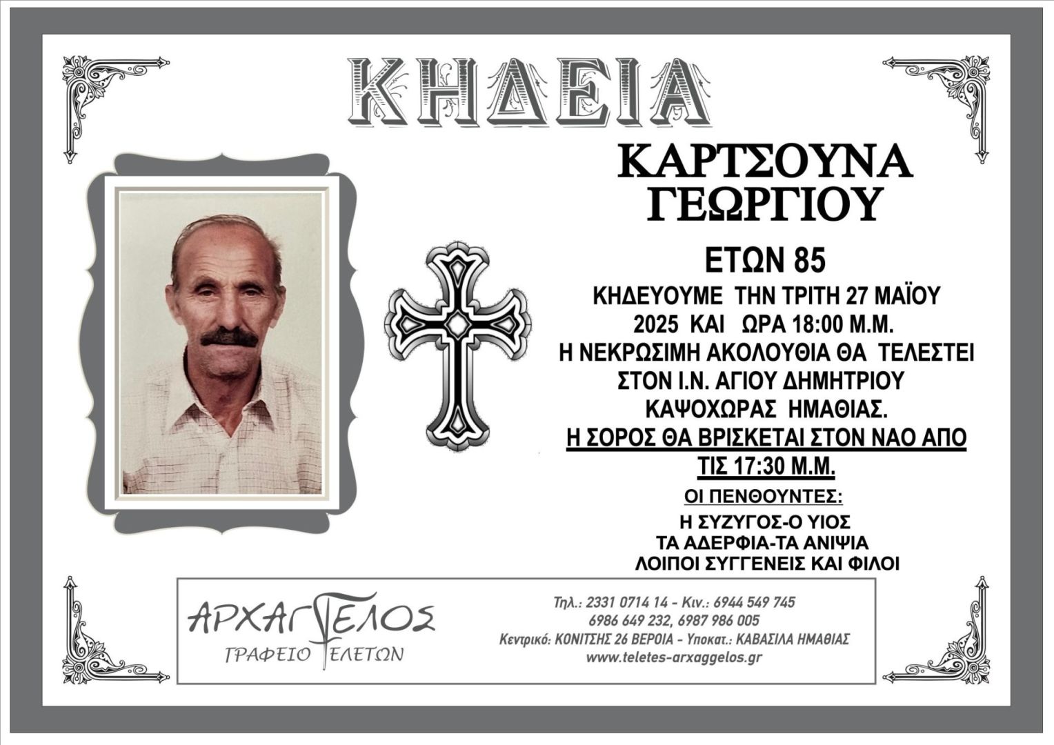 Έφυγε από τη ζωή και κηδεύεται σήμερα Τρίτη 27 Μαΐου 2025 στις 6.00 μ.μ. από τον Ιερό Ναό Αγίου Δημητρίου Καψόχωρας Ημαθίας ο Γεώργιος Καρτσούνας σε ηλικία 85 ετών