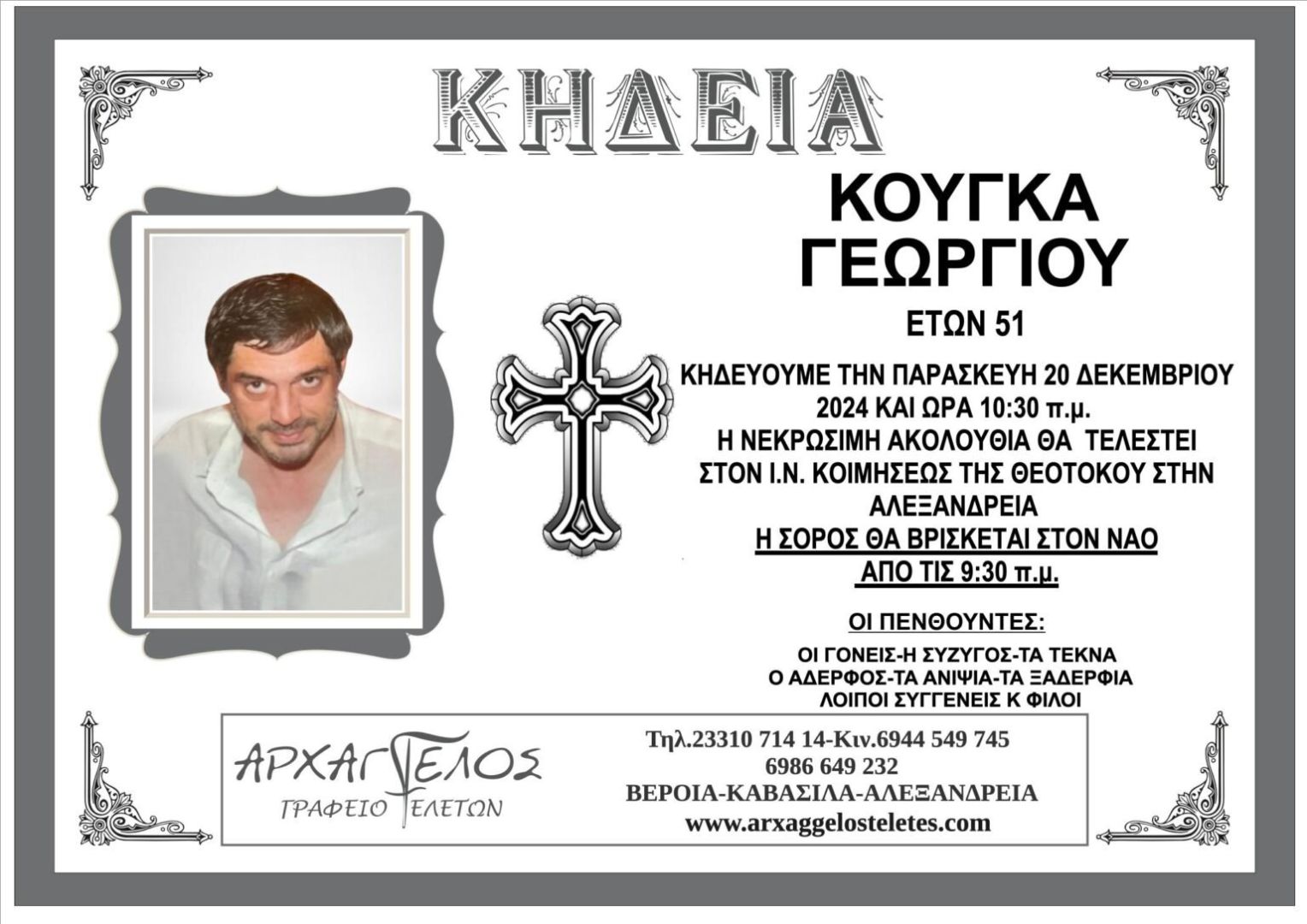 Έφυγε από τη ζωή και κηδεύεται την Παρασκευή 20 Δεκεμβρίου 2024 στις 10.30 π.μ. από τον Ιερό Ναό Κοιμήσεως της Θεοτόκου στην Αλεξάνδρεια ο Γεώργιος Κούγκας σε ηλικία 51 ετών.