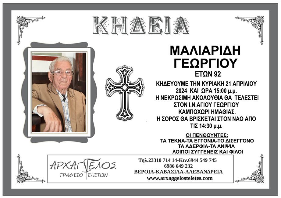 Έφυγε από τη ζωή και κηδεύεται την Κυριακή 21 Απριλίου 2024 στις 3.00 μ.μ. από τον Ιερό Ναό Αγίου Γεωργίου στο Καμποχώρι Ημαθίας ο Γεώργιος Μαλιαρίδης σε ηλικία 92 ετών.