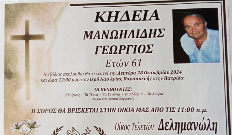 Έφυγε από τη ζωή και κηδεύτηκε την Δευτέρα 28 Οκτωβρίου 2024 στις 12.00 μ.μ. από τον Ιερό Ναό Αγίας Παρασκευής στην Πατρίδα ο Γεώργιος Μανωηλίδης σε ηλικία 61 ετών.
