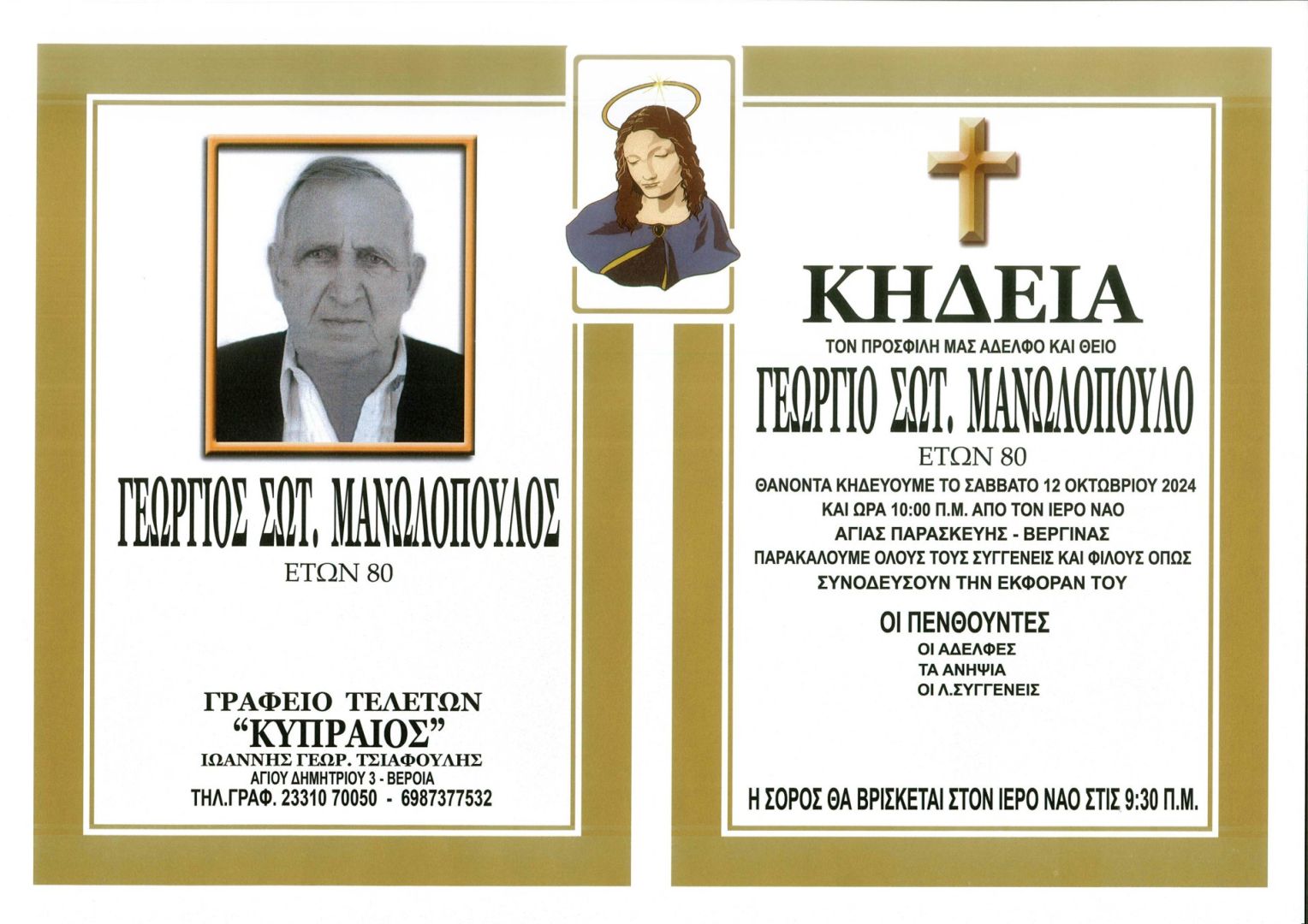 Έφυγε από τη ζωή και κηδεύεται το Σάββατο 12 Οκτωβρίου 2024 στις 10.00 π.μ. από τον Ιερό Ναό Αγίας Παρασκευής Βεργίνας ο Γεώργιος Σωτ. Μανωλόπουλος σε ηλικία 80 ετών.