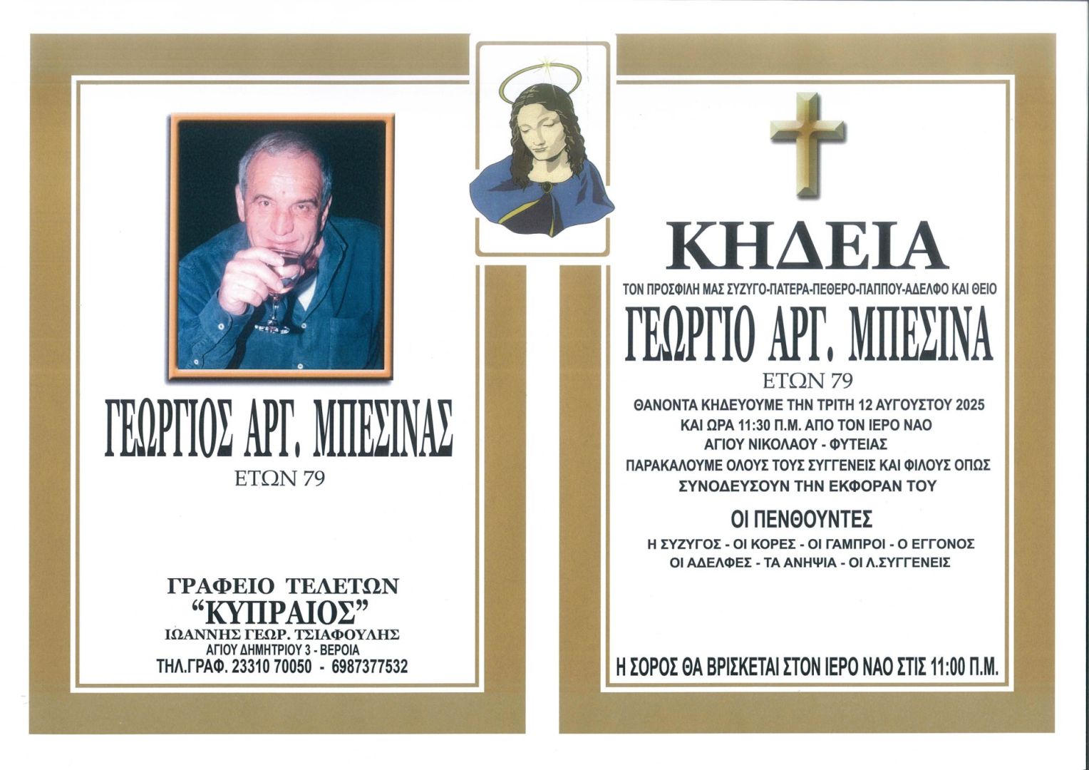 Έφυγε από τη ζωή και κηδεύεται την Τρίτη 12 Αυγούστου 2025 στις 11.30 π.μ. από τον Ιερό Ναό Αγίου Νικολάου Φυτειάς ο επί πολλά χρόνια έμπορος ξυλείας Γεώργιος Αργ. Μπεσίνας σε ηλικία 79 ετών.