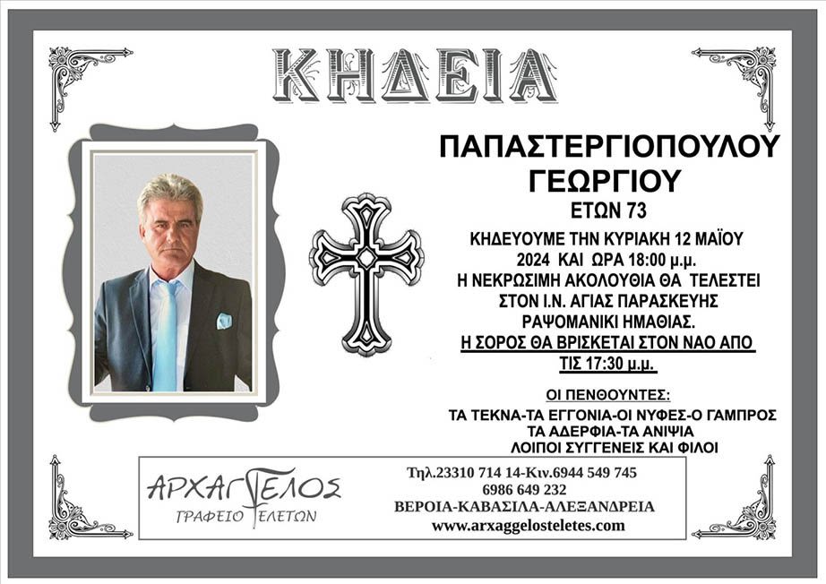 Έφυγε από τη ζωή και κηδεύεται σήμερα Κυριακή 12 Μαΐου 2024 στις 6.00 μ.μ. από τον Ιερό Ναό Αγίας Παρασκευής Ραψομανίκης Ημαθίας ο Γεώργιος Παπαστεργιόπουλος σε ηλικία 73 ετών.