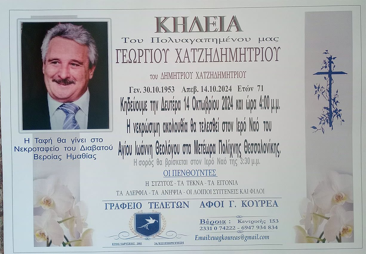 Έφυγε από τη ζωή και κηδεύτηκε την Δευτέρα 14 Οκτωβρίου 2024 στις 4.00 μ.μ. από τον Ιερό Ναό Αγίου Ιωάννη Θεολόγου στα Μετέωρα Πολίχνης Θεσσαλονίκης ο Γεώργιος Χατζηδημητρίου σε ηλικία 71 ετών. Η ταφή έγινε στο νεκροταφείο του Διαβατού Βέροιας.