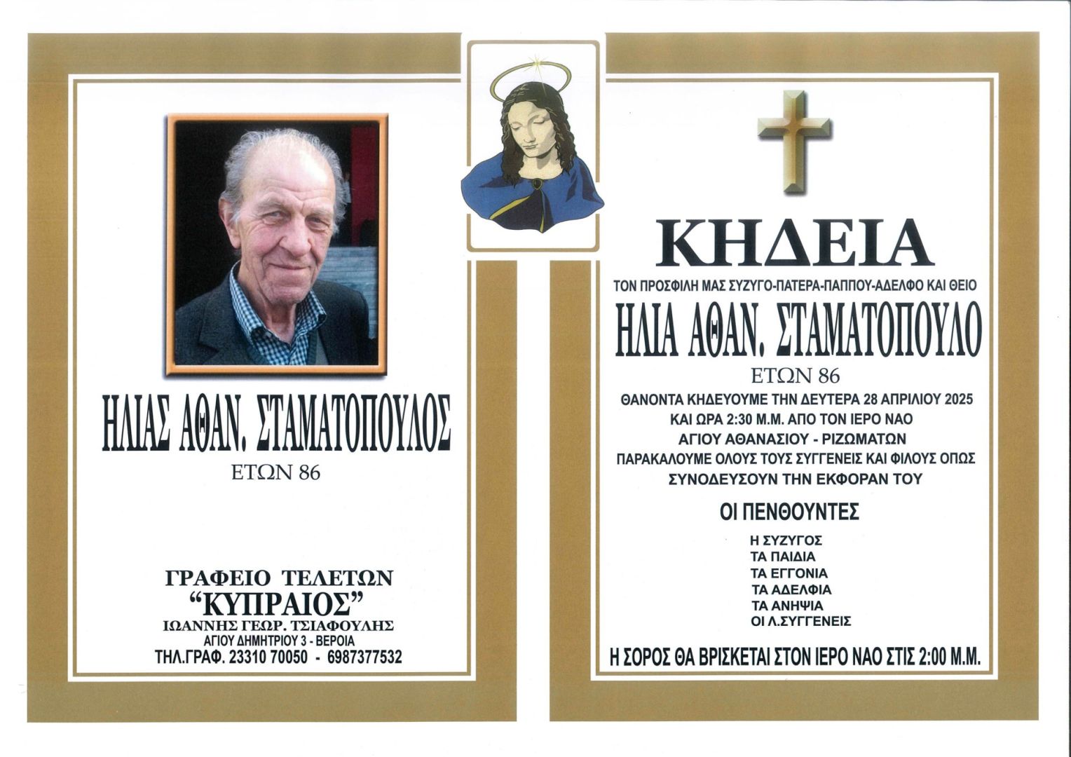 Έφυγε από τη ζωή και κηδεύεται την Δευτέρα 28 Απριλίου 2025 στις 2.30 μ.μ. από τον Ιερό Ναό Αγίου Αθανασίου Ριζωμάτων ο Ηλίας Αθαν. Σταματόπουλος σε ηλικία 86 ετών.