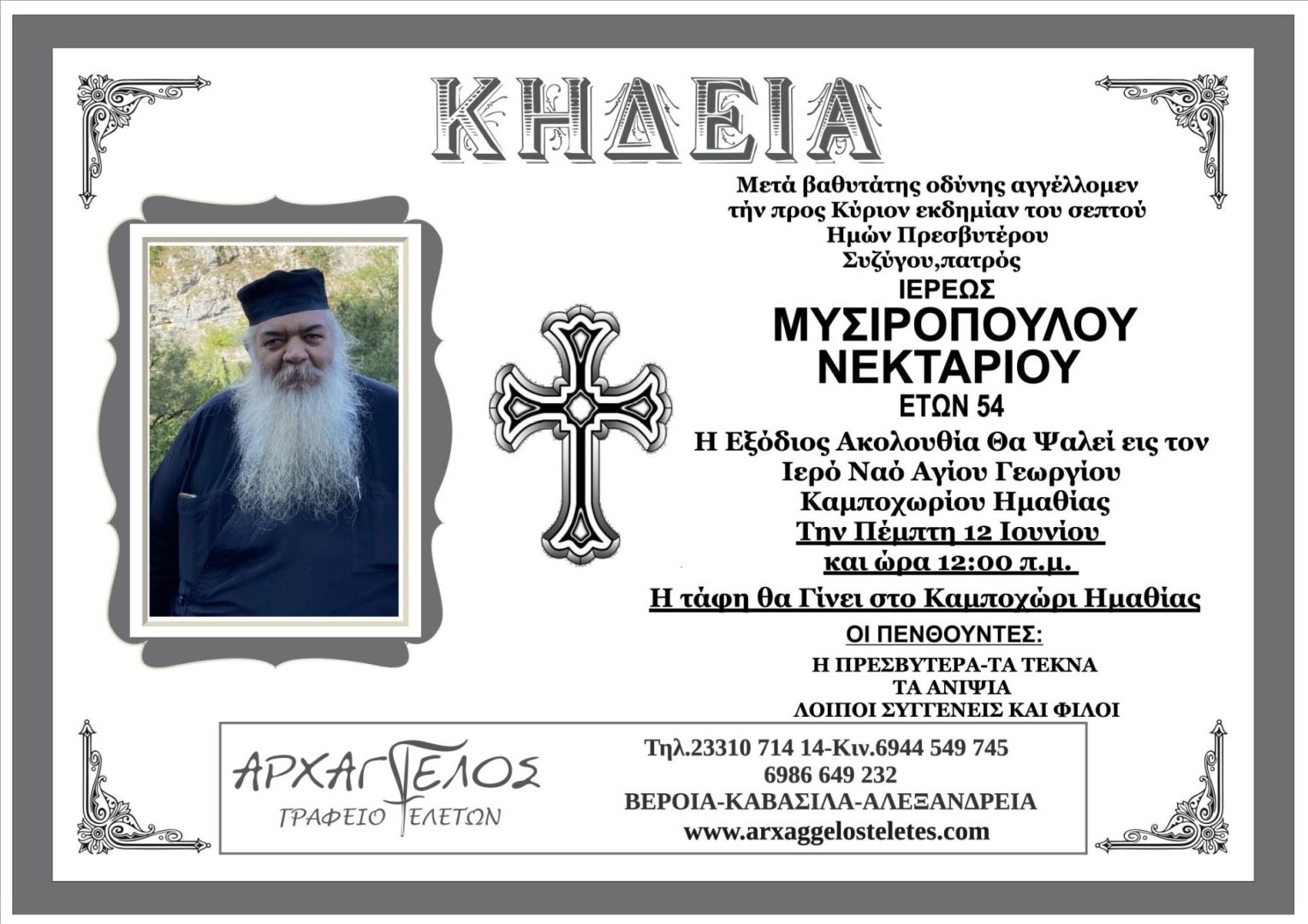 Έφυγε από τη ζωή και κηδεύεται την Πέμπτη 12 Ιουνίου στις 12.00 μ.μ. από τον Ιερό Ναό Αγίου Γεωργίου Καμποχωρίου Ημαθίας ο ιερέας Νεκτάριος Μυσιρόπουλος σε ηλικία 54 ετών.