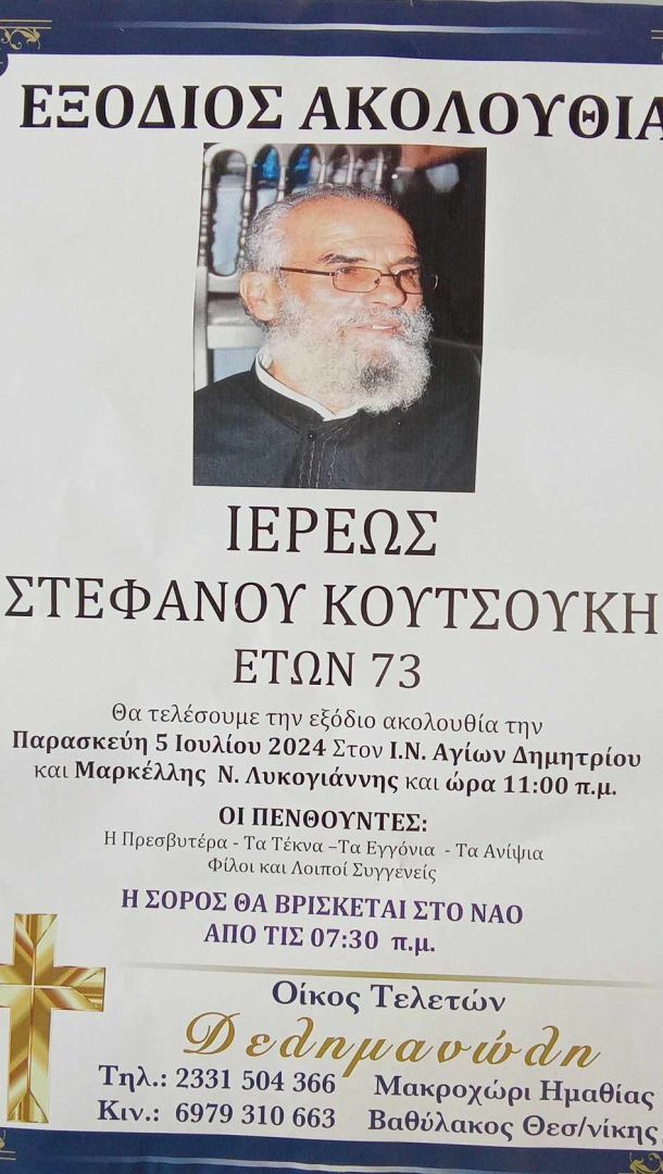Έφυγε από τη ζωή και κηδεύτηκε σήμερα Παρασκευή 5 Ιουλίου 2024 στις 11.00 π.μ. από τον Ιερό Ναό Αγίων Δημητρίου και Μαρκέλλης Ν. Λυκογιάννης ο ιερέας Στέφανος Κουτσούκης σε ηλικία 73 ετών.