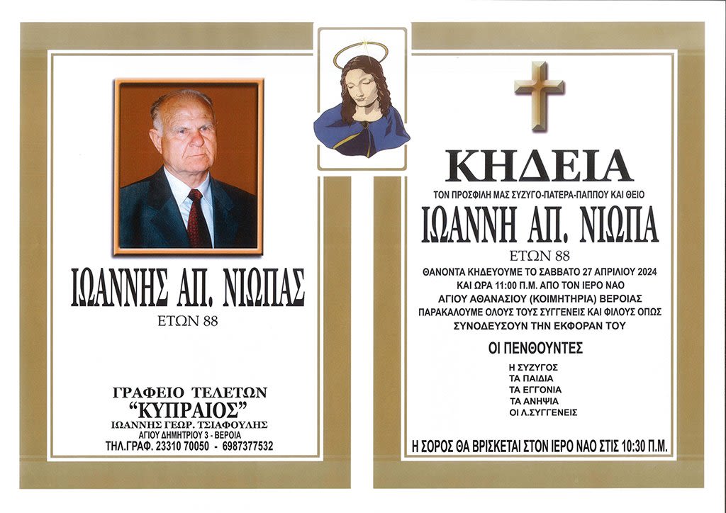 Έφυγε από τη ζωή και κηδεύεται το Σάββατο 27 Απριλίου 2024 στις 11.00 π.μ. από τον Ιερό Ναό Αγίου Αθανασίου (Κοιμητήρια) Βέροιας ο Ιωάννης Απ. Νιώπας σε ηλικία 88 ετών.