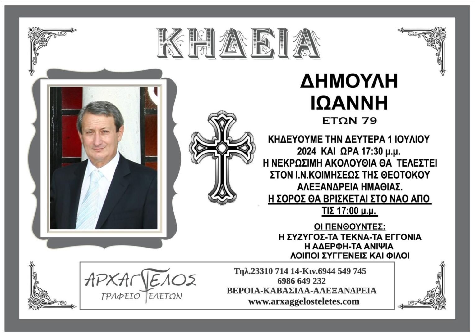 Έφυγε από την ζωή και κηδεύεται αύριο Δευτέρα 1 Ιουλίου 2024 στις 5.30μ.μ. από τον Ιερό Ναό Κοιμήσεως της Θεοτόκου Αλεξάνδρειας ο Ιωάννης Δημούλης, πρώην δήμαρχος Αλεξάνδρειας, σε ηλικία 79 ετών.