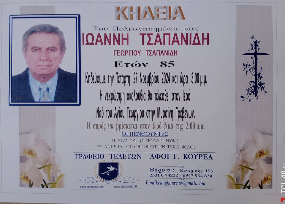 Έφυγε από τη ζωή και κηδεύεται την Τετάρτη 27 Νοεμβρίου 2024 στις 3.00 μ.μ. από τον Ιερό Ναό Αγίου Γεωργίου στην Μυρσίνη Γρεβενών ο Ιωάννης Τσαπανίδης σε ηλικία 85 ετών.