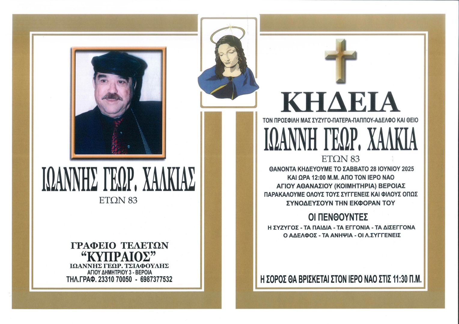 Έφυγε από τη ζωή και κηδεύεται το Σάββατο 28 Ιουνίου 2025 στις 12.00 μ.μ. από τον Ιερό Ναό Αγίου Αθανασίου (Κοιμητήρια) Βέροιας ο Ιωάννης Γεωρ. Χαλκιάς σε ηλικία 83 ετών.