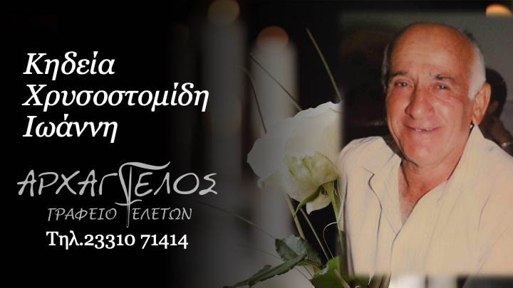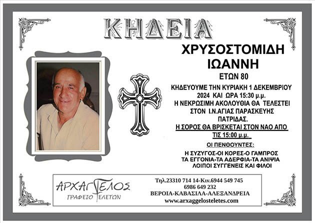 Έφυγε από τη ζωή και κηδεύεται σήμερα Κυριακή 1 Δεκεμβρίου 2024 στις 3.30 μ.μ. από τον Ιερό Ναό Αγίας Παρασκευής Πατρίδας, ο Ιωάννης Χρυσοστομίδης σε ηλικία 80 ετών.