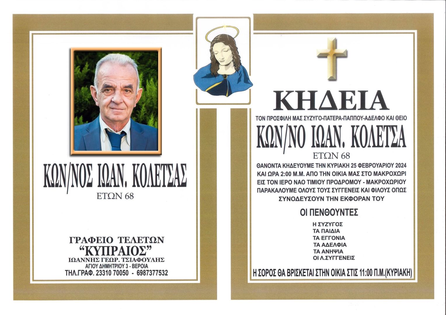 Έφυγε από τη ζωή και κηδεύεται την Κυριακή 25 Φεβρουαρίου 2024 στις 2.00 μ.μ. από τον Ιερό Ναό Τιμίου Προδρόμου στο Μακροχώρι ο Κων/νος Ιωαν. Κολέτσας σε ηλικία 68 ετών.