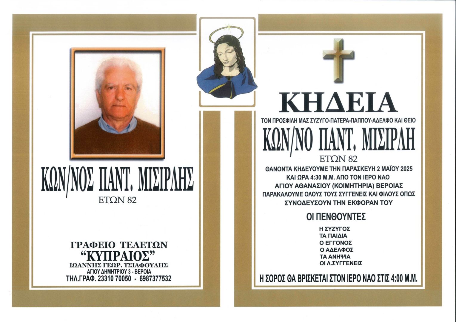 Έφυγε από τη ζωή και κηδεύεται την Παρασκευή 2 Μαΐου 2025 στις 4.30 μ.μ. από τον Ιερό Ναό Αγίου Αθανασίου (Κοιμητήρια) Βέροιας ο Κων/νος Παντ. Μισιρλής σε ηλικία 82 ετών.