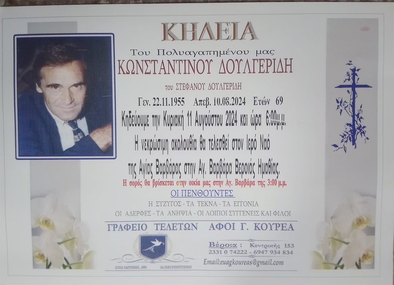 Έφυγε από τη ζωή και κηδεύτηκε την Κυριακή 11 Αυγούστου 2024 στις 6.00 μ.μ. από τον Ιερό Ναό Αγίας Βαρβάρας στην Αγ. Βαρβάρα Βέροιας ο Κωνσταντίνος Στεφ. Δουλγερίδης σε ηλικία 69 ετών.