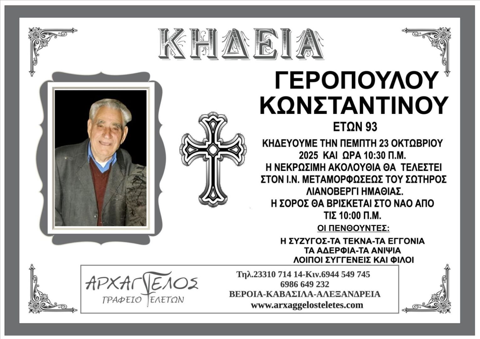 Έφυγε από τη ζωή και κηδεύεται την Πέμπτη 23 Οκτωβρίου 2025 στις 10.30 π.μ. από τον Ιερό Ναό Μεταμορφώσεως του Σωτήρος στο Λιανοβέργι Ημαθίας ο Κωνσταντίνος Γερόπουλος σε ηλικία 93 ετών.