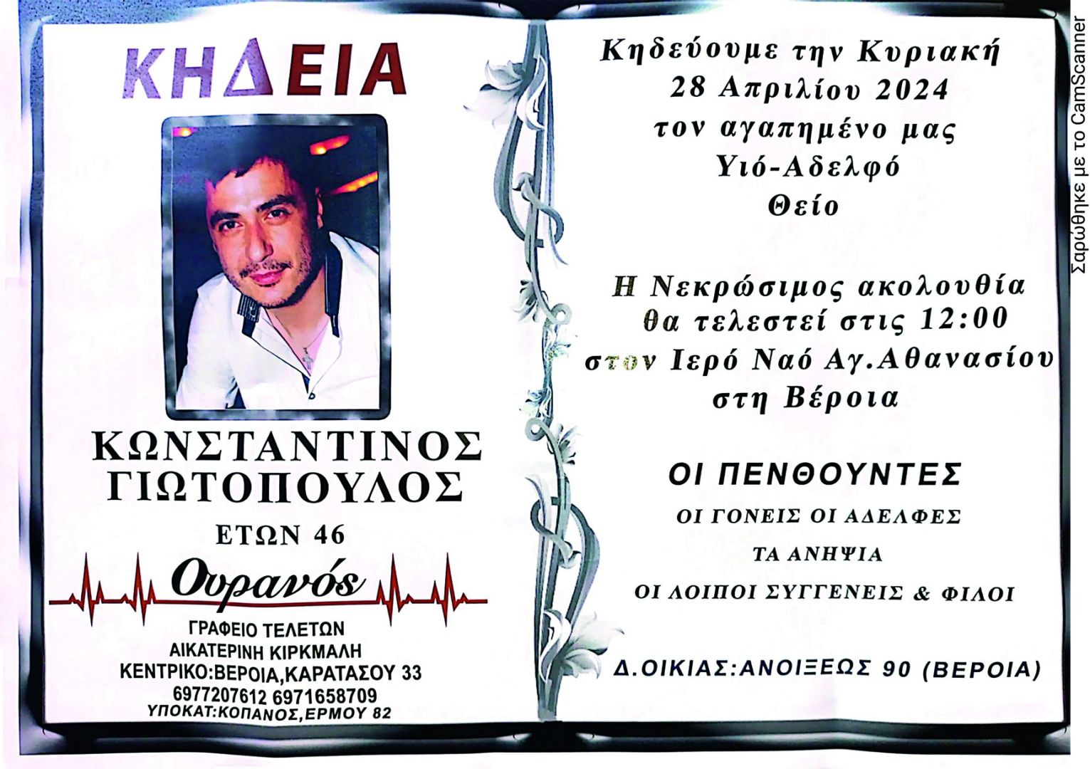 Έφυγε από τη ζωή και κηδεύεται την Κυριακή 28 Απριλίου 2024 στις 12.00 μ.μ. από τον Ιερό Ναό Αγίου Αθανασίου (Κοιμητήρια) Βέροιας ο Κωνσταντίνος Γιωτόπουλος σε ηλικία 46 ετών.