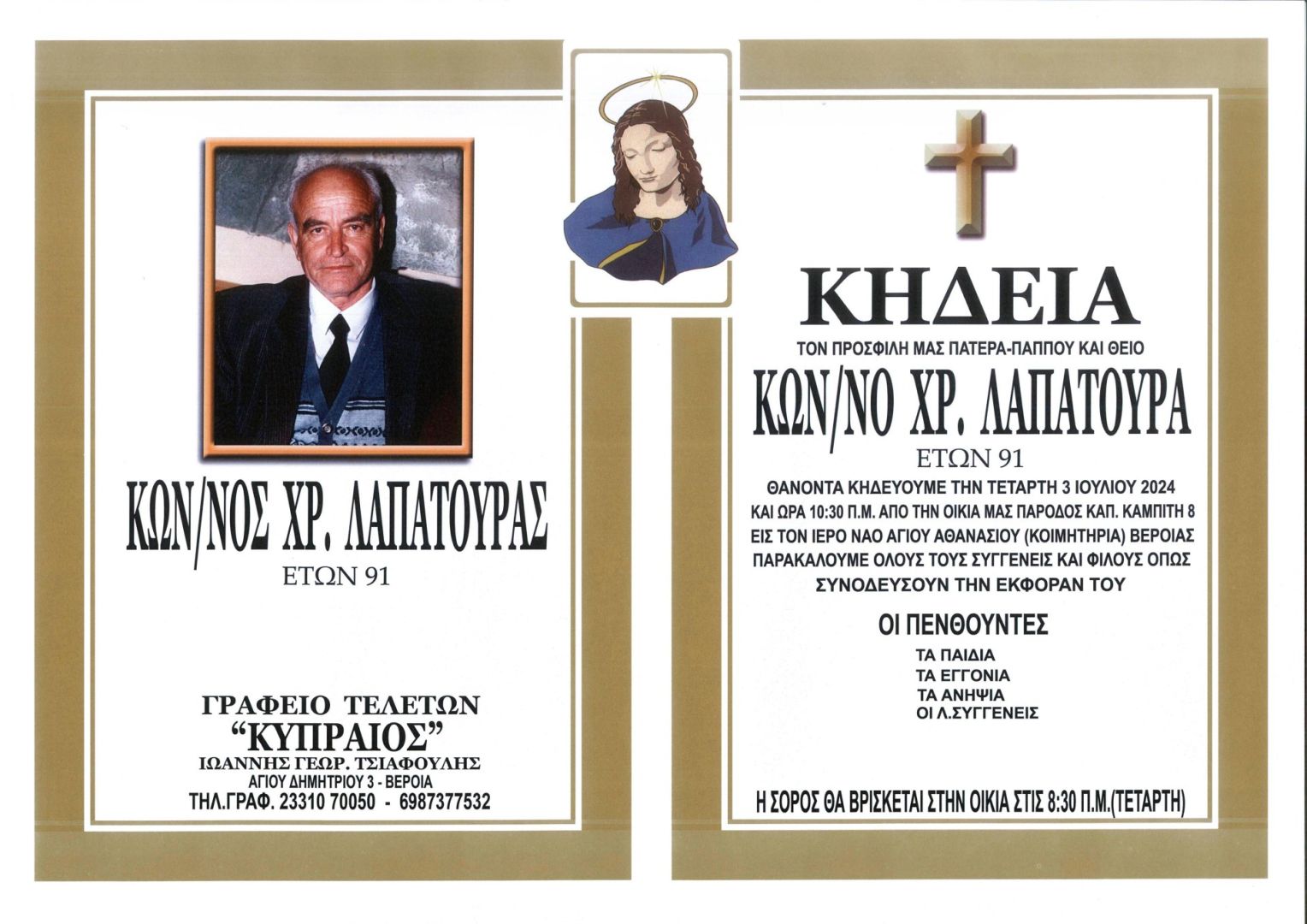 Έφυγε από τη ζωή και κηδεύεται την Τετάρτη 3 Ιουλίου 2024 στις 10.30 π.μ. από τον Ιερό Ναό Αγίου Αθανασίου (Κοιμητήρια) Βέροιας ο Κων/νος Χρ. Λαπατούρας σε ηλικία 91 ετών.
