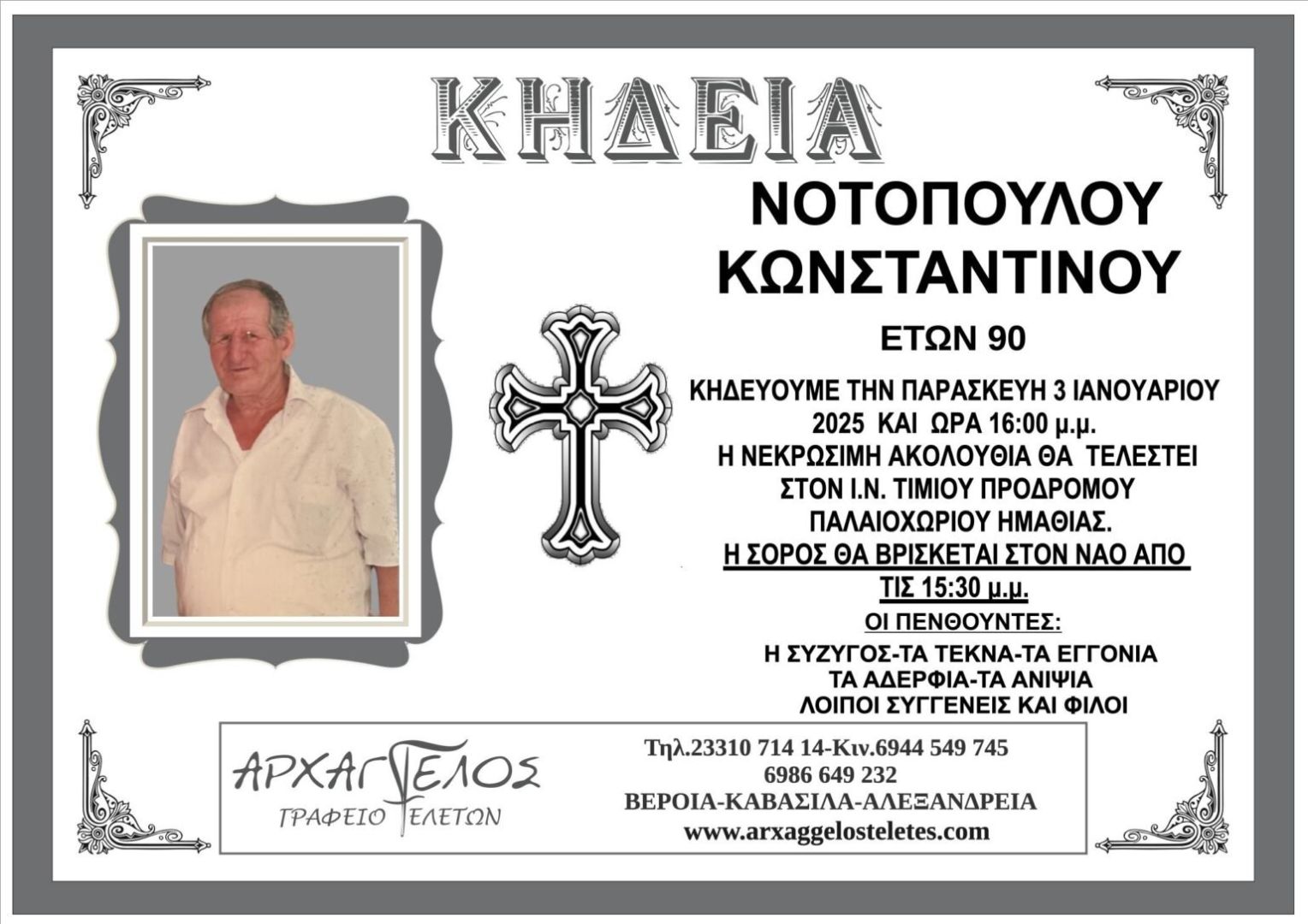 Έφυγε από τη ζωή και κηδεύτηκε την Παρασκευή 3 Ιανουαρίου 2025 στις 4.00 μ.μ. από τον Ιερό Ναό Τιμίου Προδρόμου Παλαιοχωρίου Ημαθίας ο Κωνσταντίνος Νοτόπουλος σε ηλικία 90 ετών.