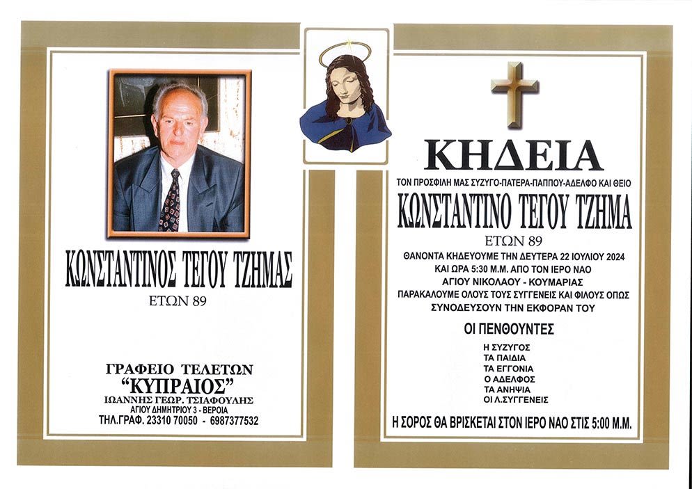 Έφυγε από τη ζωή και κηδεύεται αύριο Δευτέρα 22 Ιουλίου 2024 στις 5.30μ.μ. από τον Ιερό Ναό Αγίου Νικολάου Κουμαριάς ο Κωνσταντίνος Τέγου Τζήμας σε ηλικία 89 ετών.
