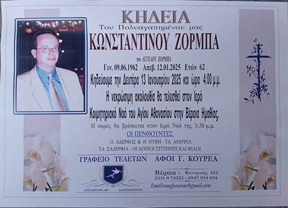 Έφυγε από τη ζωή και κηδεύεται σήμερα Δευτέρα 13 Ιανουαρίου 2025 στις 4.00 μ.μ. από τον Ιερό Κοιμητηριακό Ναό Του Αγίου Αθανασίου στην Βέροια Ημαθίας, ο Κωνσταντίνος Ζορμπάς σε ηλικία 62 ετών.