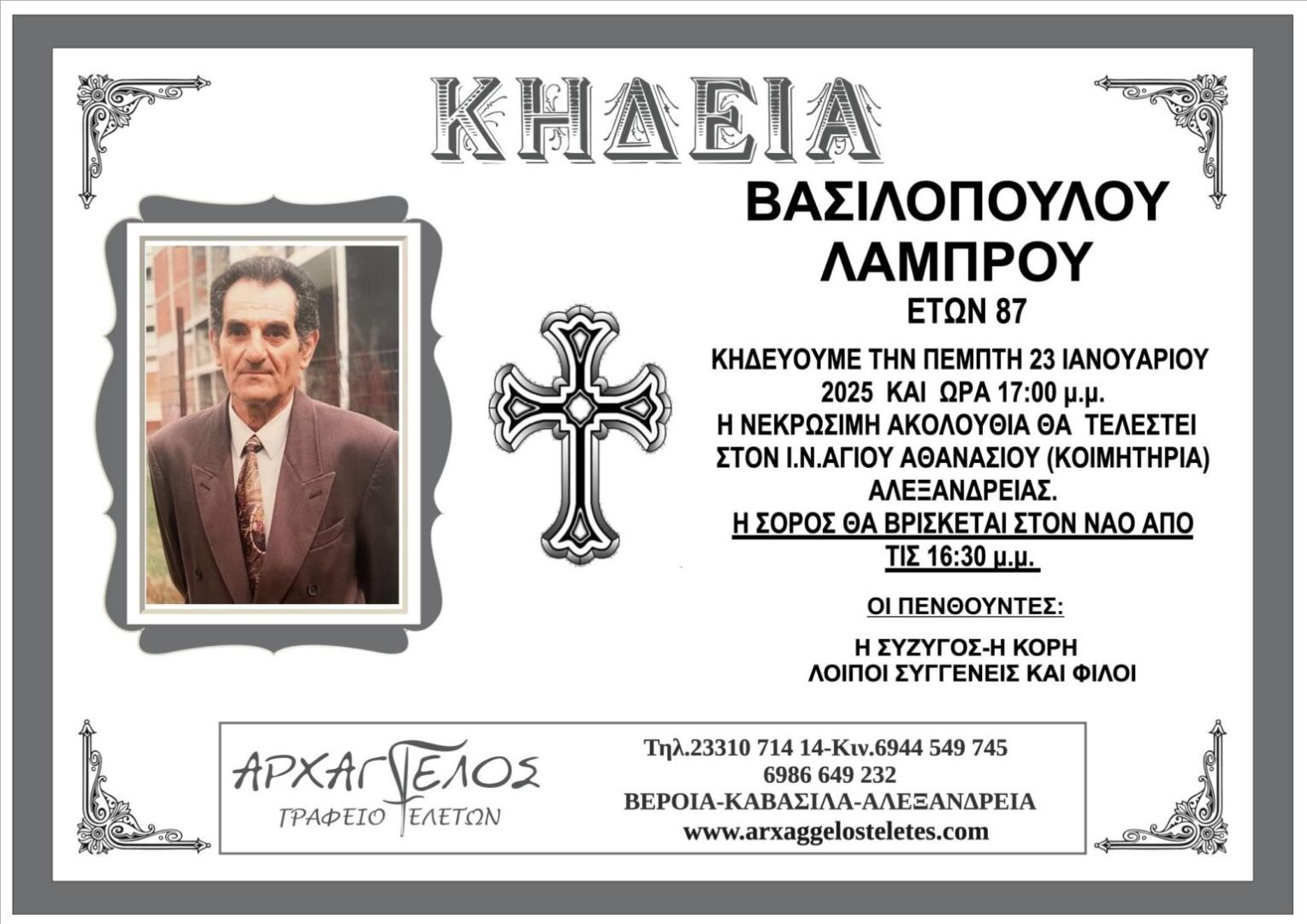 Έφυγε από τη ζωή και κηδεύεται την Πέμπτη 23 Ιανουαρίου 2025 στις 5.00 μ.μ. από τον Ιερό Ναό Αγίου Αθανασίου Κοιμητήρια Αλεξάνδρειας ο Λάμπρος Βασιλόπουλος σε ηλικία 87 ετών.