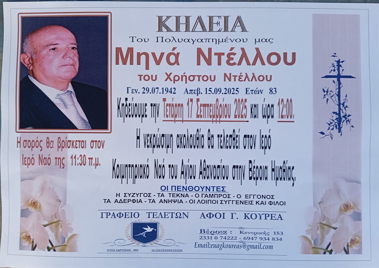 Έφυγε από τη ζωή και κηδεύεται την Τετάρτη 17 Σεπτεμβρίου 2025 στις 12.00 μ.μ. από τον Ιερό Ναό Αγίου Αθανασίου (Κοιμητήρια) Βέροιας ο Μηνάς Ντέλλου σε ηλικία 83 ετών.