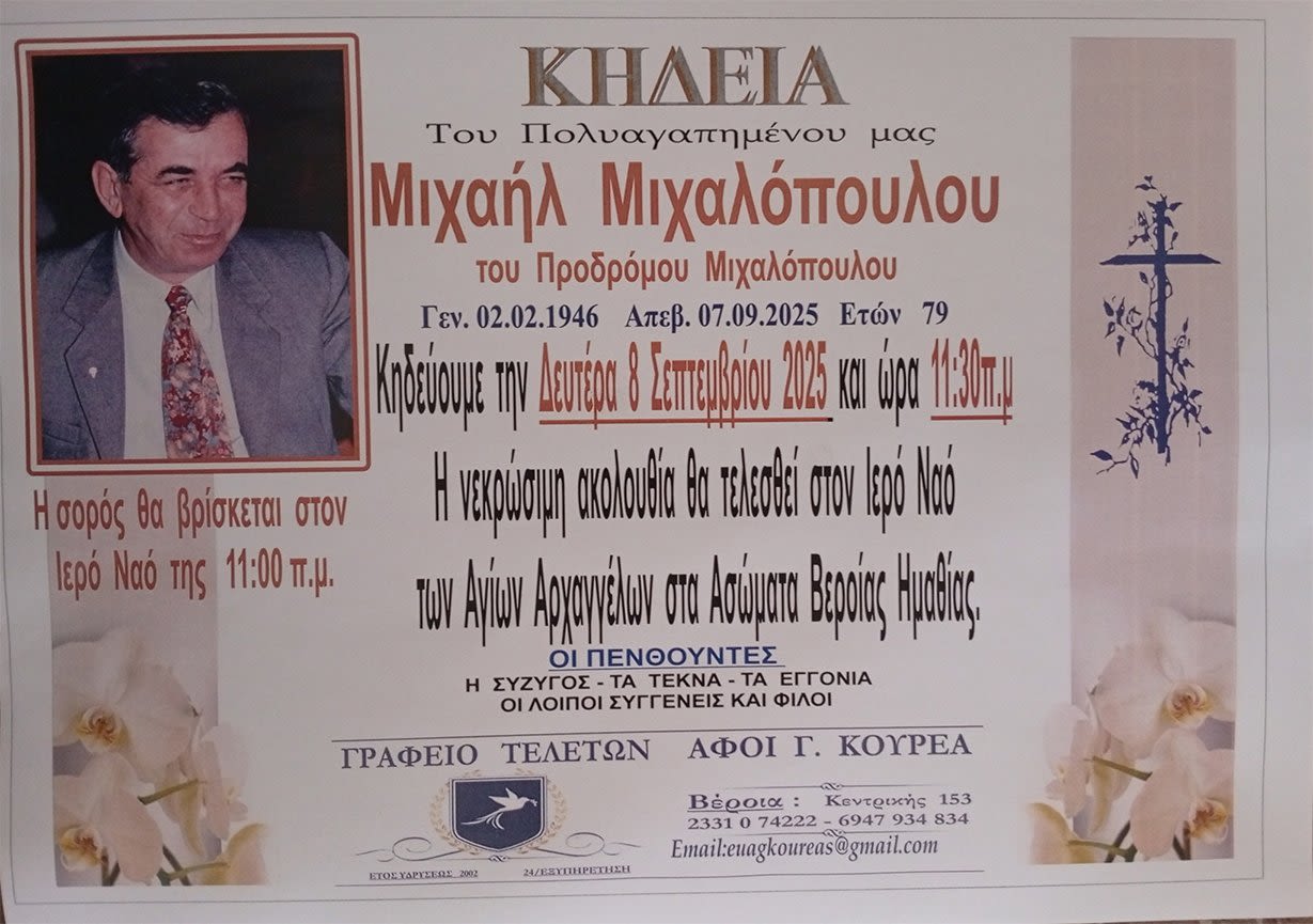 Έφυγε από τη ζωή και κηδεύεται την Δευτέρα 8 Σεπτεμβρίου 2025 στις 11.30 π.μ. από τον Ιερό Ναό Αγίων Αρχαγγέλων στα Ασώματα Βέροιας ο Μιχαήλ Μιχαλόπουλος σε ηλικία 79 ετών.