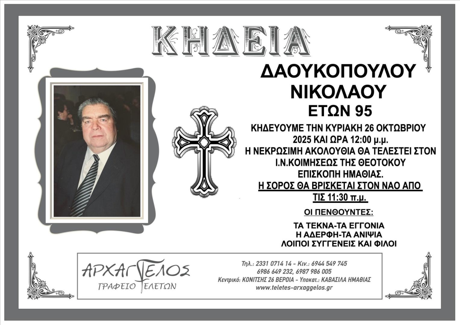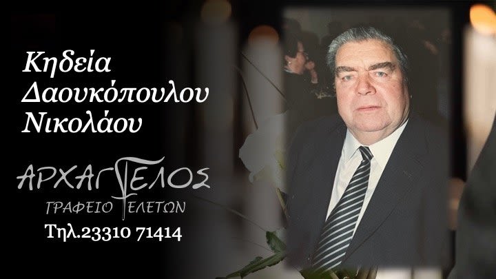 Έφυγε από τη ζωή και κηδεύεται την Κυριακή 26 Οκτωβρίου 2025 στις 12.00 μ.μ. από τον Ιερό Ναό Κοιμήσεως της Θεοτόκου Επισκοπής Ημαθίας ο Νικόλαος Δαουκόπουλος σε ηλικία 95 ετών.