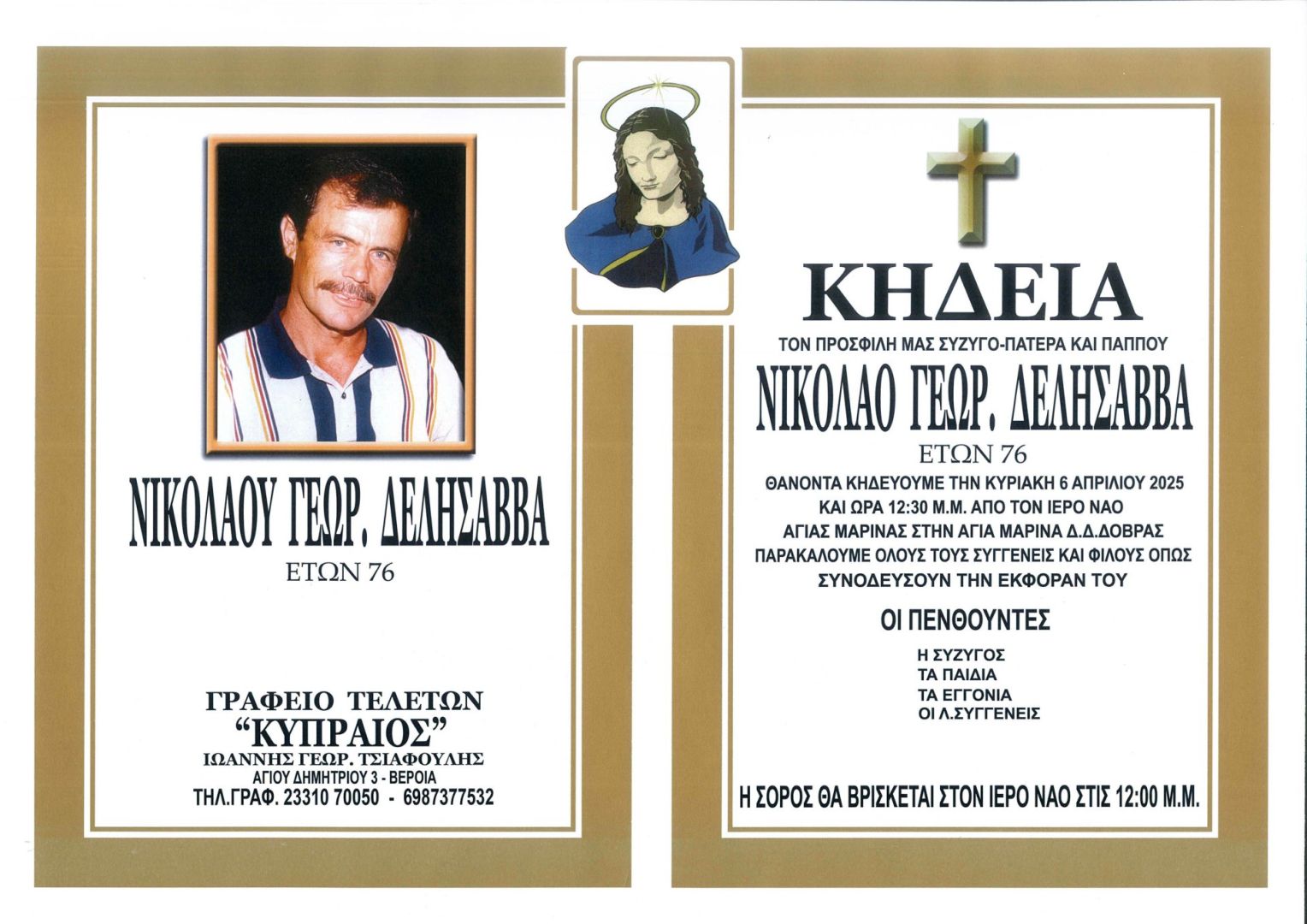 Έφυγε από τη ζωή και κηδεύεται την Κυριακή 6 Απριλίου 2025 στις 12.30 μ.μ. από τον Ιερό Ναό Αγίας Μαρίνας στην Αγία Μαρίνα Δ.Δ. Δοβρά ο Νικόλαος Γεωρ. Δελησάββας σε ηλικία 76 ετών.