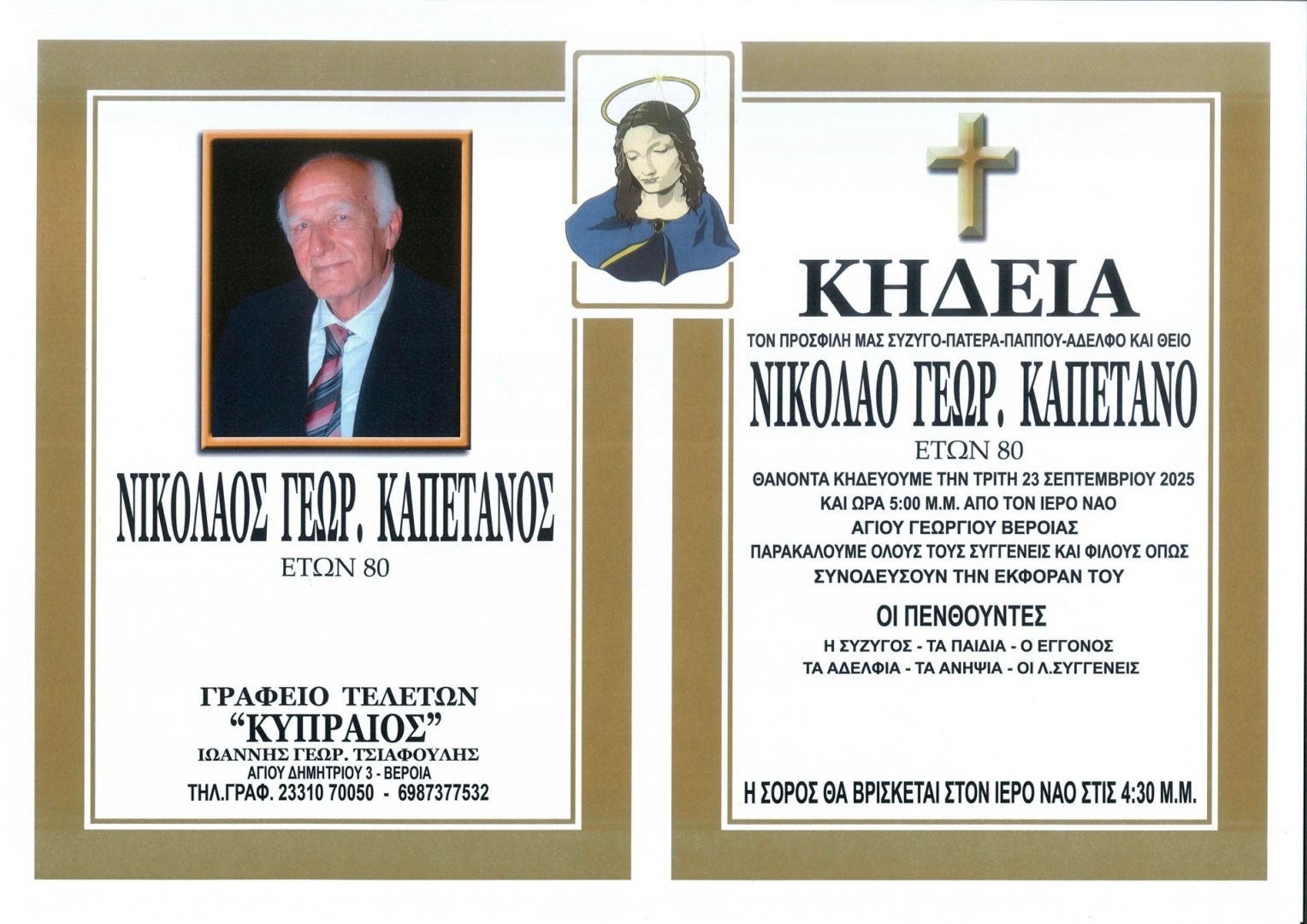 Έφυγε από τη ζωή και κηδεύεται την Τρίτη 23 Σεπτεμβρίου 2025 στις 5.00 μ.μ. από τον Ιερό Ναό Αγίου Γεωργίου Βέροιας ο Νικόλαος Γεωρ. Καπετάνος σε ηλικία 80 ετών.