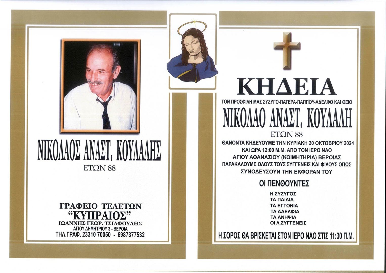 Έφυγε από τη ζωή και κηδεύεται σήμερα Κυριακή 20 Οκτωβρίου 2024 στις 12.00 μ.μ. από τον Ιερό Αγίου Αθανασίου (Κοιμητήρια) Βέροιας ο Νικόλαος Αναστ. Κουλάλης σε ηλικία 88 ετών.