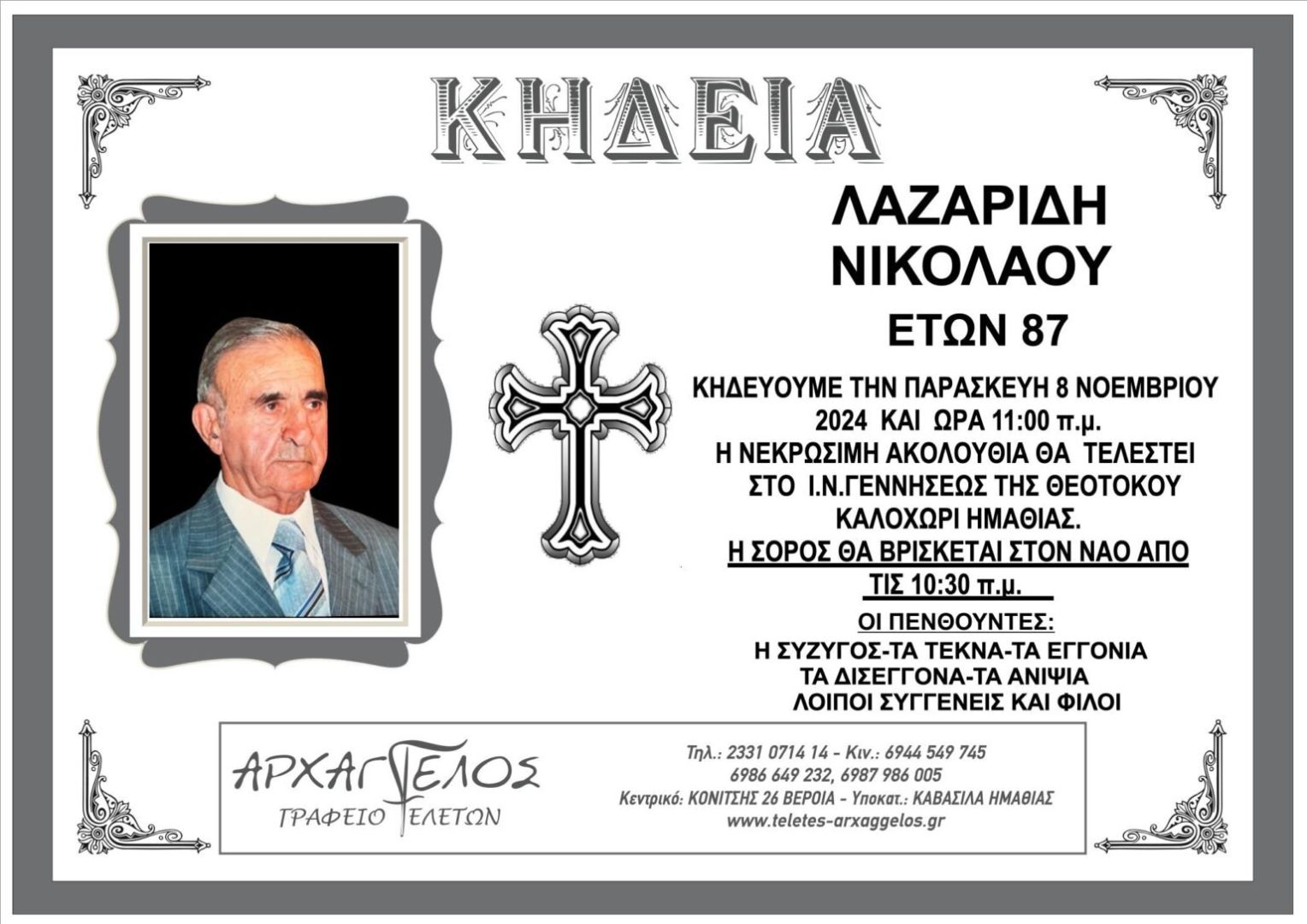 Έφυγε από τη ζωή και κηδεύεται την Παρασκευή 8 Νοεμβρίου 2024 στις 11.00 π.μ. από τον Ιερό Ναό Γεννήσεως της Θεοτόκου στο Καλοχώρι Ημαθίας ο Νικόλαος Λαζαρίδης σε ηλικία 87 ετών.