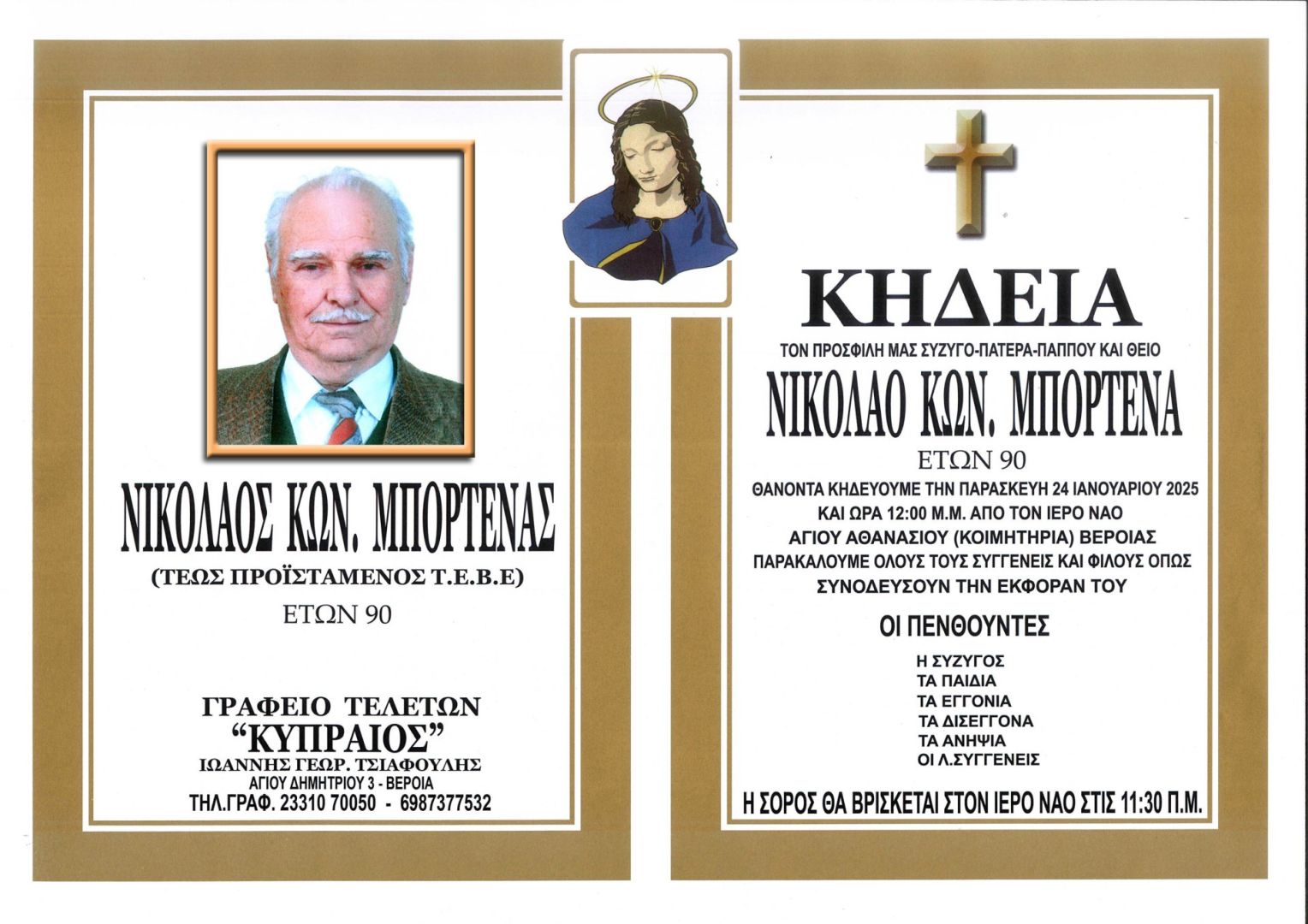Έφυγε από τη ζωή και κηδεύεται την Παρασκευή 24 Ιανουαρίου 2025 στις 12.00 μ.μ. από τον Ιερό Ναό Αγίου Αθανασίου (Κοιμητήρια) Βέροιας ο τέως Προϊστάμενος ΤΕΒΕ Νικόλαος Κων. Μπορτένας σε ηλικία 90 ετών.
