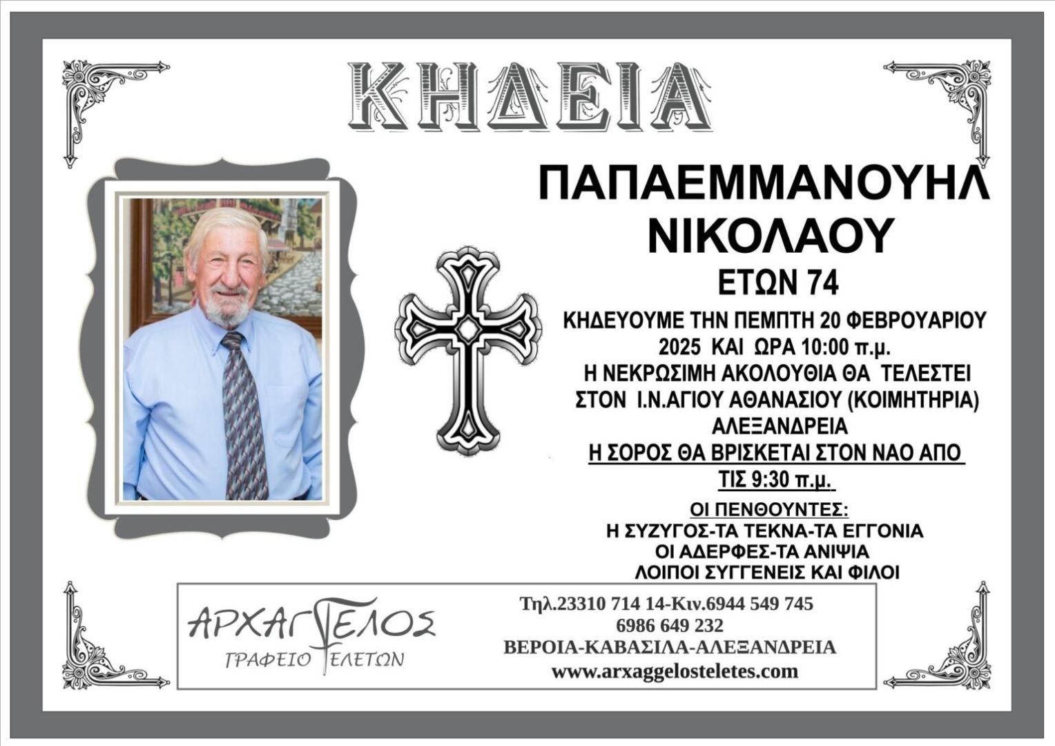 Έφυγε από τη ζωή και κηδεύεται την Πέμπτη 20 Φεβρουαρίου 2025 στις 10.00 π.μ. από τον Ιερό Ναό Αγίου Αθανασίου (Κοιμητήρια) Αλεξάνδρειας ο Νικόλαος Παπαεμμανουήλ σε ηλικία 74 ετών.