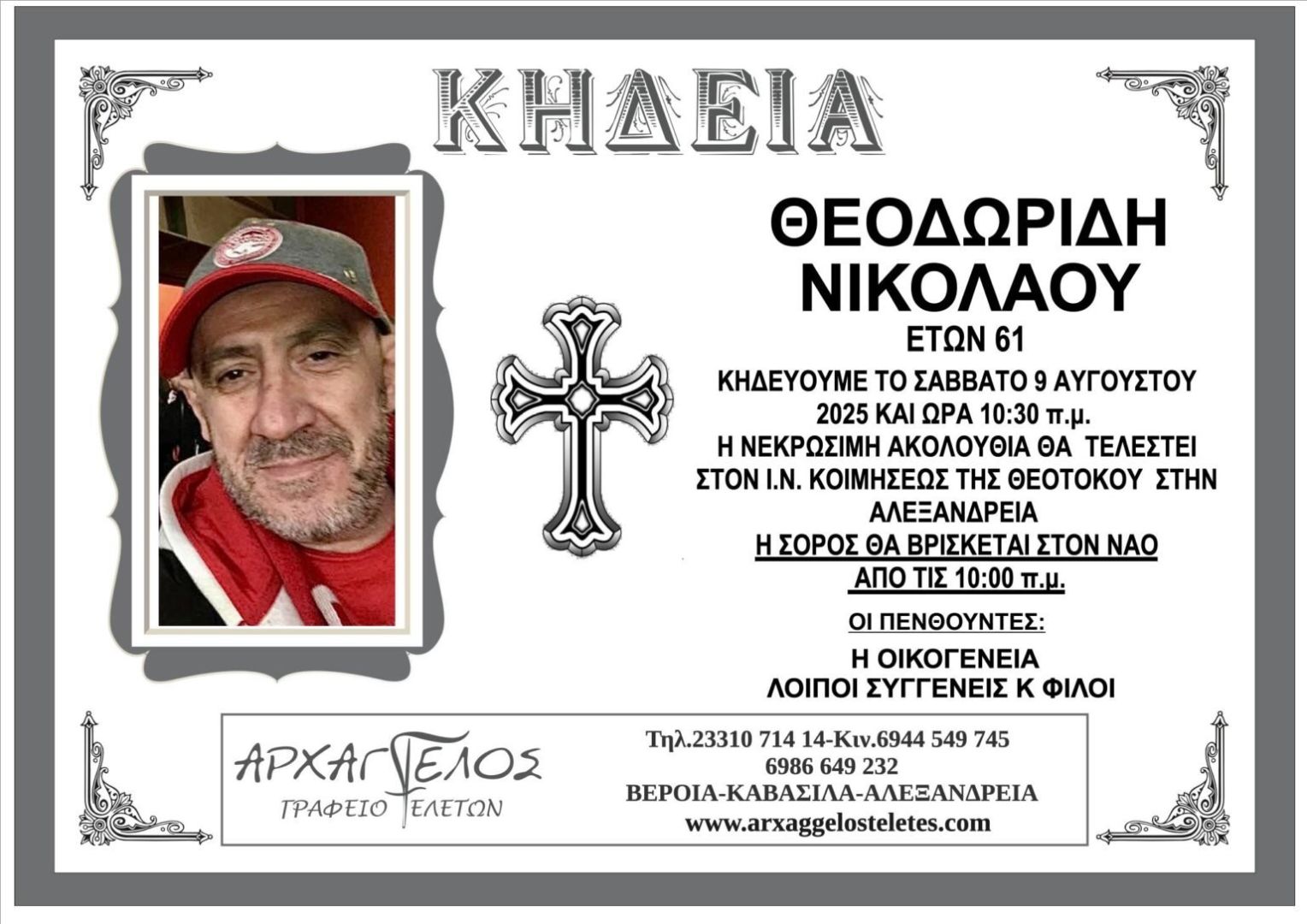 Έφυγε από τη ζωή και κηδεύεται το Σάββατο 9 Αυγούστου 2025 στις 10.30 π.μ. από τον Ιερό Ναό Κοιμήσεως της Θεοτόκου στην Αλεξάνδρεια ο Νικόλαος Θεοδωρίδης σε ηλικία 61 ετών.