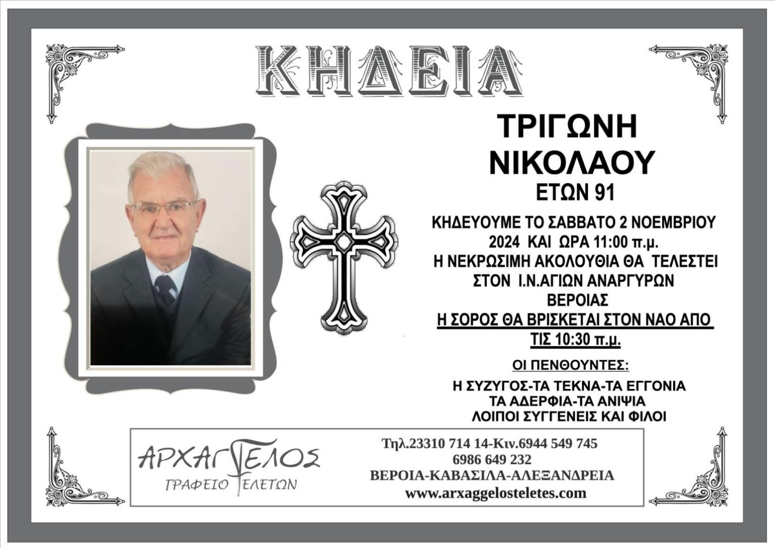 Έφυγε από τη ζωή και κηδεύεται το Σάββατο 2 Νοεμβρίου 2024 στις 11.00 π.μ. από τον Ιερό Ναό Αγίων Αναργύρων Βέροιας ο Νικόλαος Τριγώνης σε ηλικία 91 ετών.
