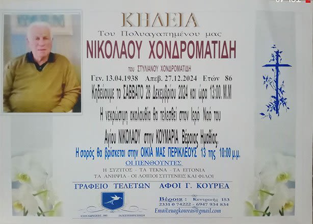 Έφυγε από τη ζωή και κηδεύτηκε το Σάββατο 28 Δεκεμβρίου 2024 στις 1.00 μ.μ. από τον Ιερό Ναό Αγίου Νικολάου στην Κουμαριά ο Νικόλαος Χονδροματίδης σε ηλικία 86 ετών.