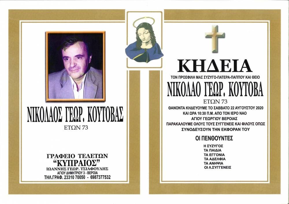 Στις 10.30 το πρωί του Σαββάτου θα γίνει στον ναό Αγίου Γεωργίου της Βέροιας η κηδεία του Νίκου Κουτόβα, που σε ηλικία 73 ετών άφησε την τελευταία του πνοή το μεσημέρι της Παρασκευής.