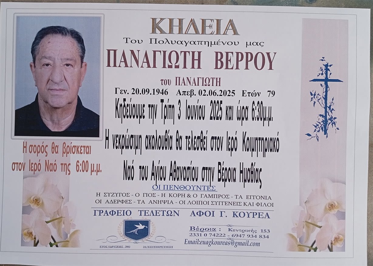 Έφυγε από τη ζωή και κηδεύεται την Τρίτη 3 Ιουνίου 2025 στις 6.30 μ.μ. από τον Ιερό Ναό Αγίου Αθανασίου (Κοιμητήρια) Βέροιας ο Παναγιώτης Βέρρος σε ηλικία 79 ετών.