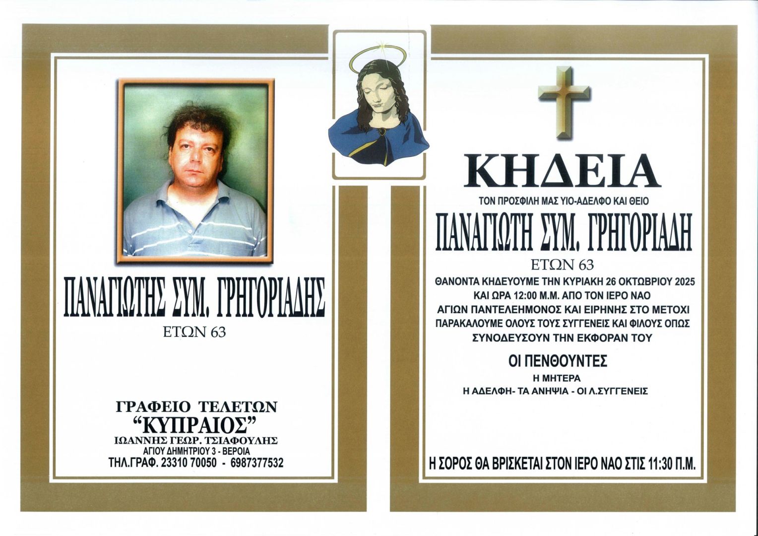 Έφυγε από τη ζωή και κηδεύεται την Κυριακή 26 Οκτωβρίου 2025 στις 12.00 μ.μ. από τον Ιερό Ναό Αγίων Παντελεήμονος και Ειρήνης στο Μετόχι ο Παναγιώτης Συμ. Γρηγοριάδης σε ηλικία 63 ετών.