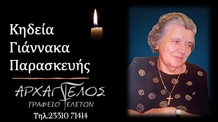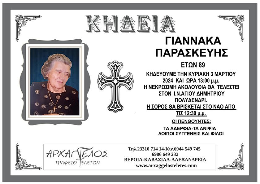 Έφυγε από τη ζωή και κηδεύεται την Κυριακή 3 Μαρτίου 2024 στις 1.00 μ.μ. από τον Ιερό Ναό Αγίου Δημητρίου στο Πολυδένδρι η Παρασκευή Γιάννακα σε ηλικία 89 ετών.