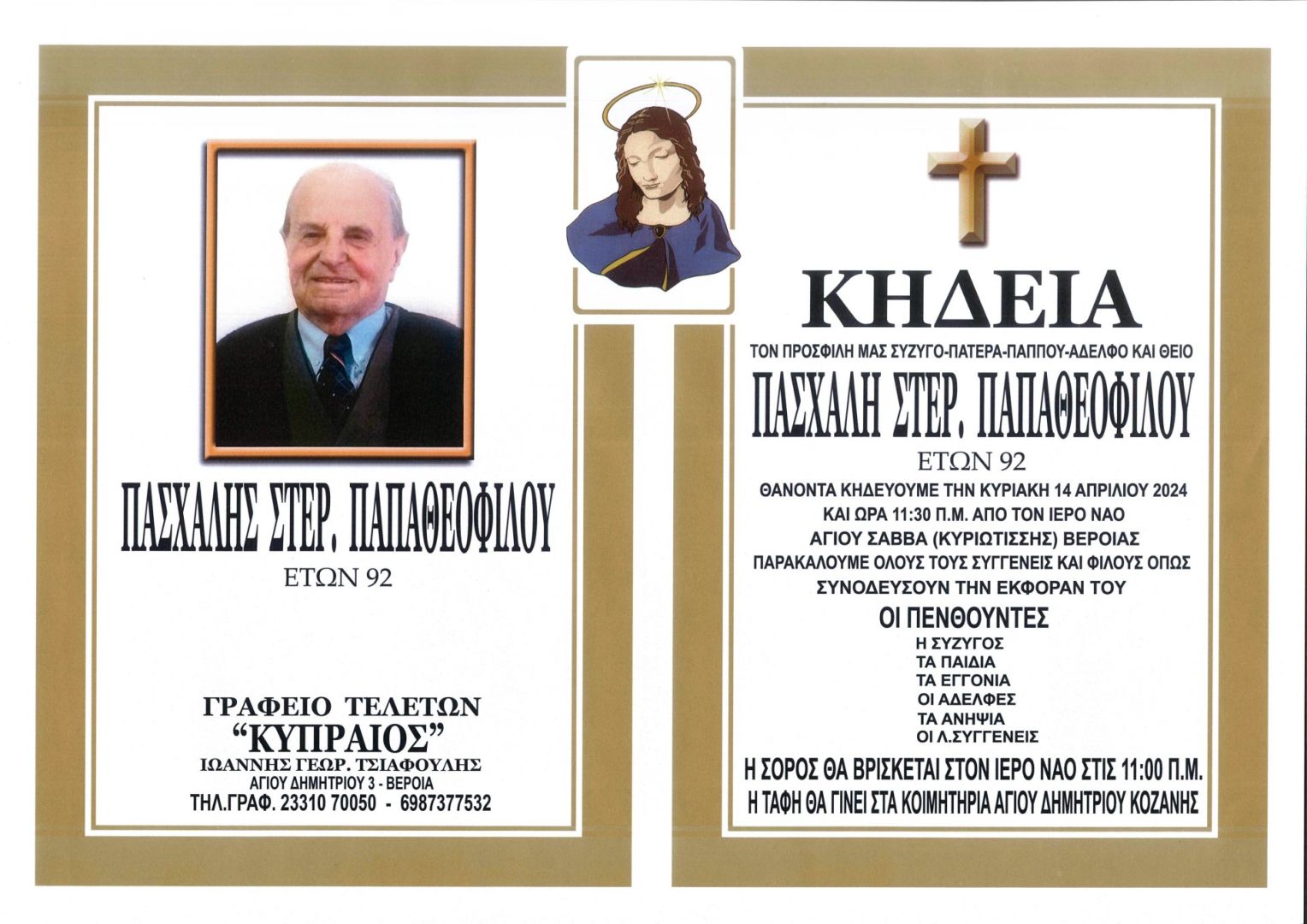 Έφυγε από τη ζωή και κηδεύεται την Κυριακή 14 Απριλίου 2024 στις 11.30 π.μ. από τον Ιερό Ναό Αγίου Σάββα Κυριωτίσσης Βέροιας ο Πασχάλης Στερ. Παπαθεοφίλου σε ηλικία 92 ετών.