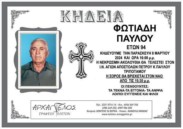 Έφυγε από τη ζωή και κηδεύεται σήμερα Παρασκευή 8 Μαρτίου 2024 στις 4.00 μ.μ. από τον Ιερό Ναό Αγίων Αποστόλων Πέτρου και Παύλου Τριποτάμου ο Παύλος Φωτιάδης σε ηλικία 94 ετών.