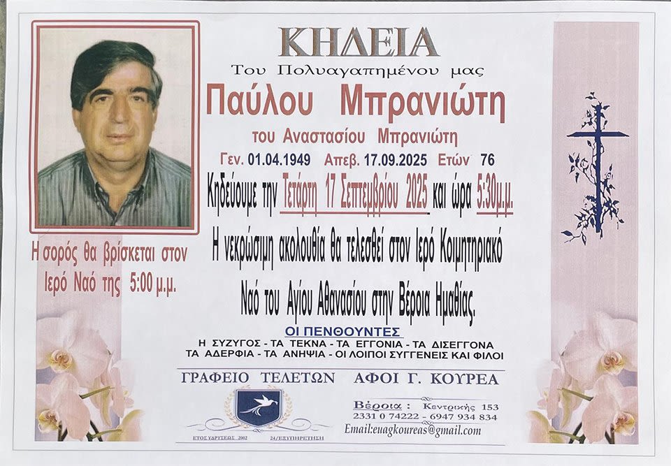 Έφυγε από τη ζωή και κηδεύεται σήμερα Τετάρτη 17 Σεπτεμβρίου 2025 στις 5.30 μ.μ. από τον Ιερό Ναό Αγίου Αθανασίου (Κοιμητήρια) Βέροιας ο Παύλος Αναστ. Μπρανιώτης σε ηλικία 76 ετών.